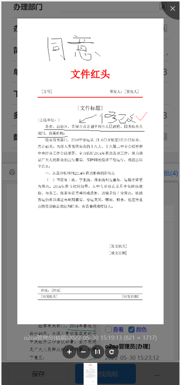 在一些流程中,比如收文,正文内容不会被修改,这个时候可以设置手写签批不保存正文。这种场景下的手写签批文件,系统可以叠加多个签批展现,并会以不同的颜色来区分不同处理人。