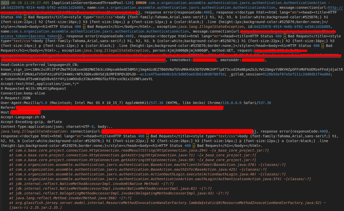 比如这里日志显示在实现单点登陆过程中访问远程认证服务器返回400错误,导致单点登陆失败。