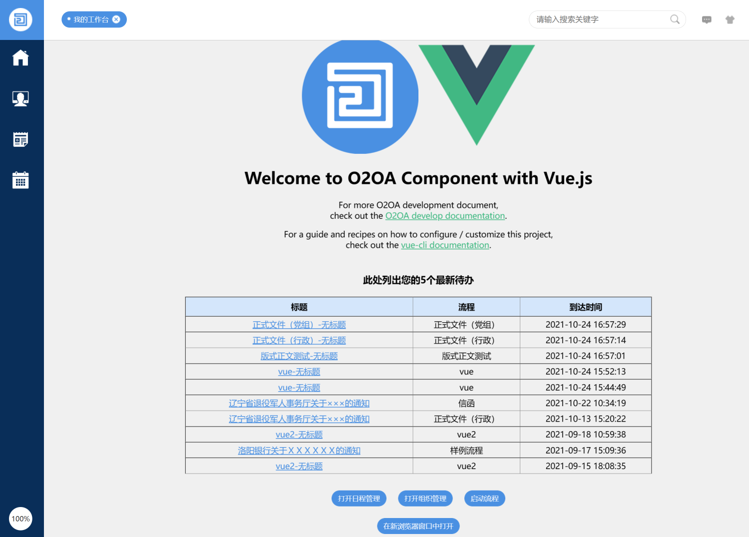 这个就是默认的O2OAcomponent组件,它主要实现了列示当前用户最新的5个待办,以及打开日程安排、打开组织管理,启动流程等样例功能。