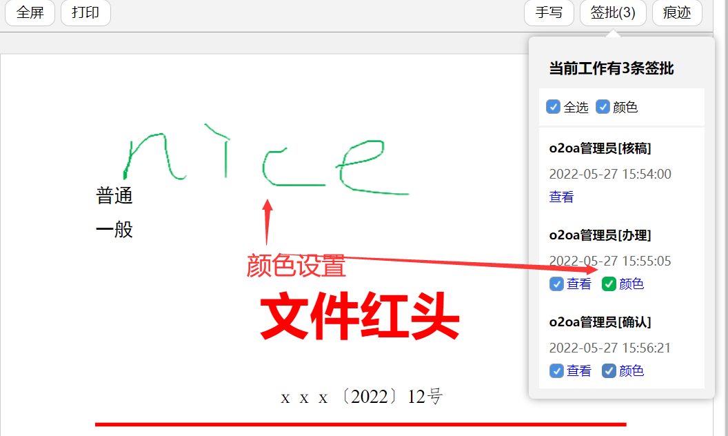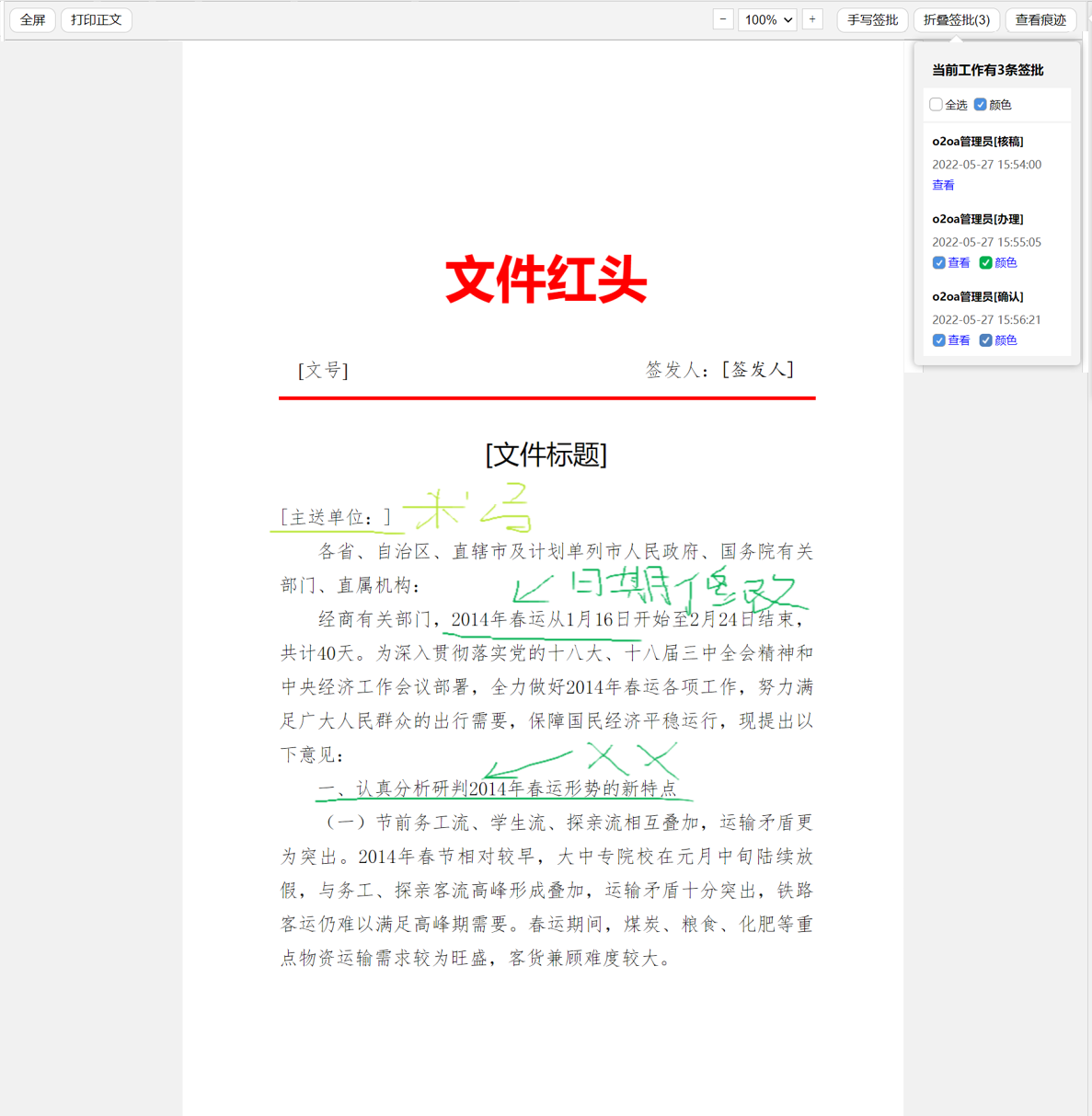 在一些流程中,比如收文,正文内容不会被修改,这个时候可以设置手写签批不保存正文。这种场景下的手写签批文件,系统可以叠加多个签批展现,并会以不同的颜色来区分不同处理人。